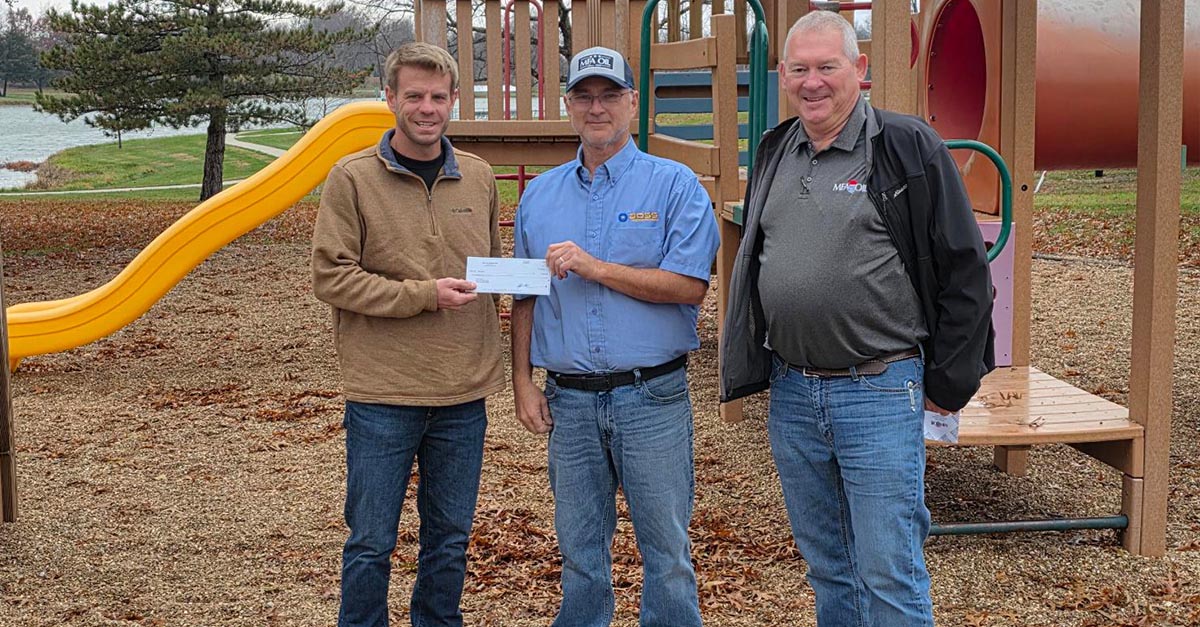 Above: MFA Oil plant manager Kelly Van Dusen (center) and District Manager Tony Johnson (right) present a check to Parks Work in Marceline, Mo., to help purchase new playground equipment.